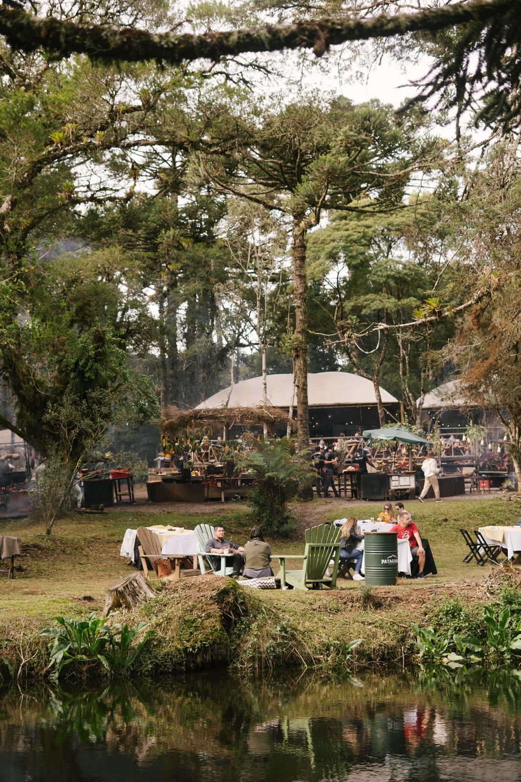costelão bovino e leitão, assados lentamente na lenha por 8 horas, além de cordeiro orgânico e galeto ao primo canto. Acompanha ainda pratos quentes servidos no fogão campeiro como