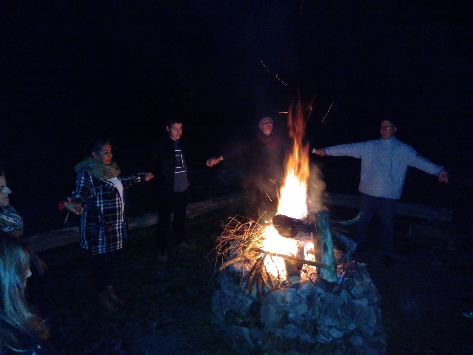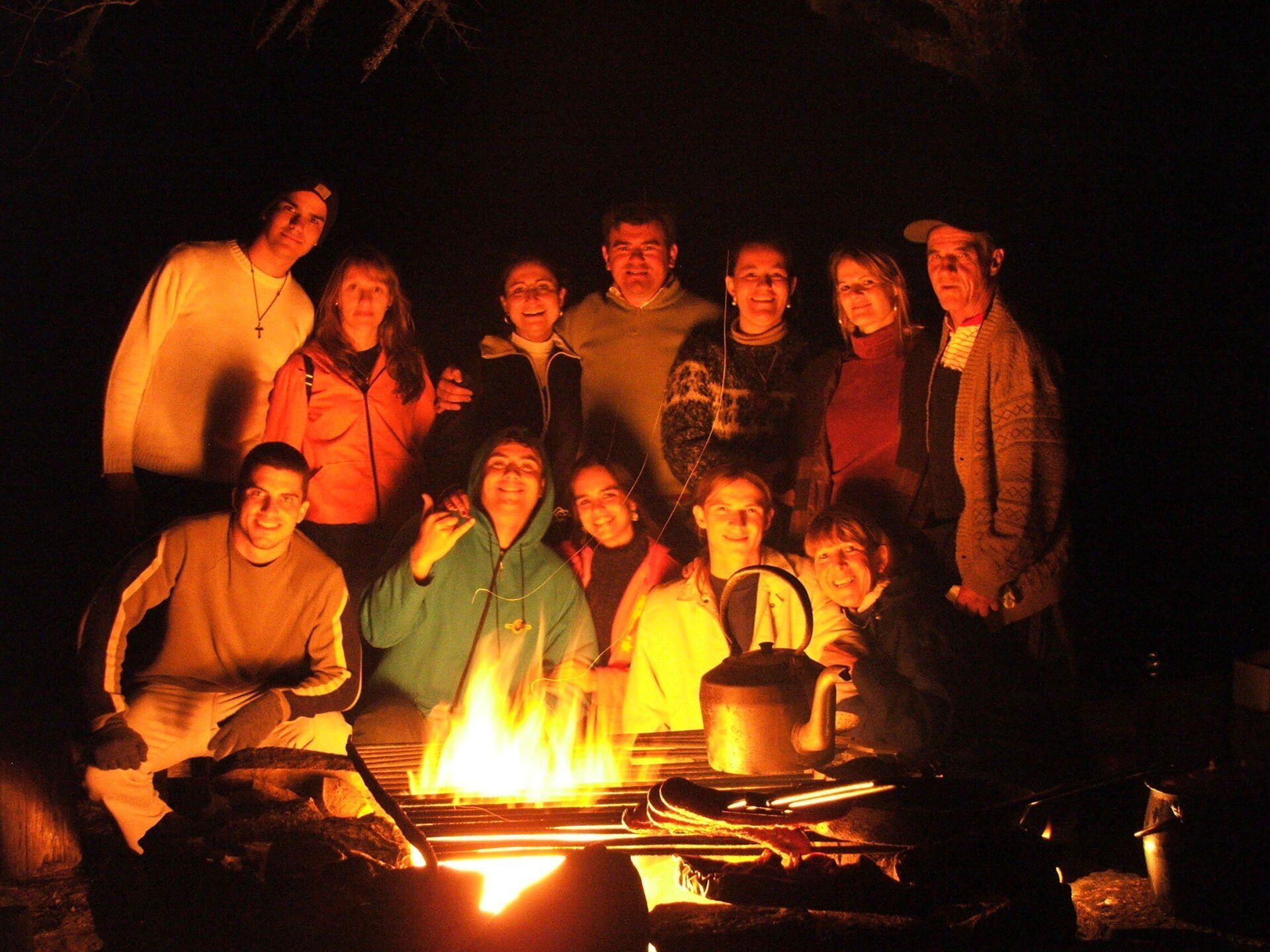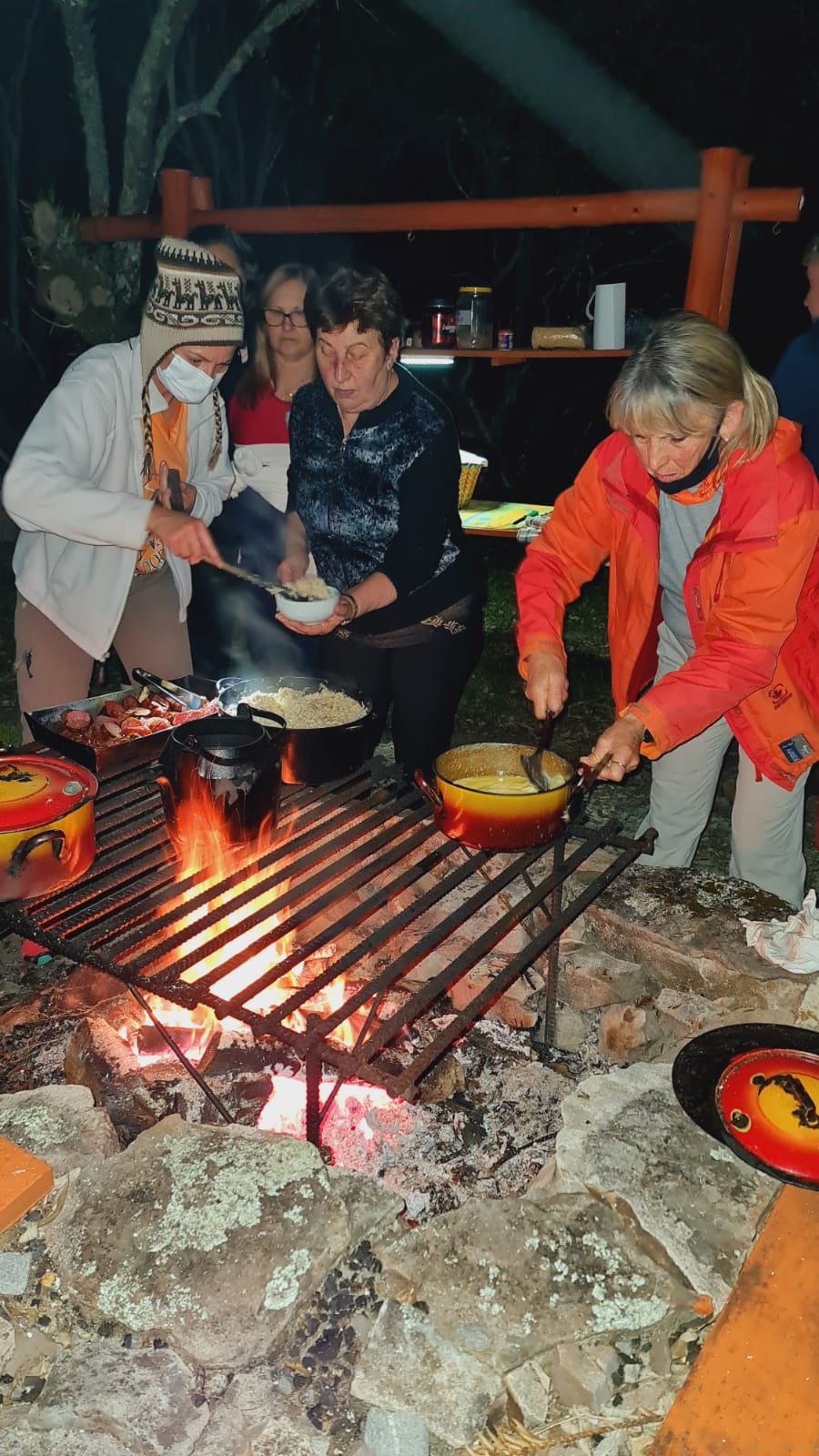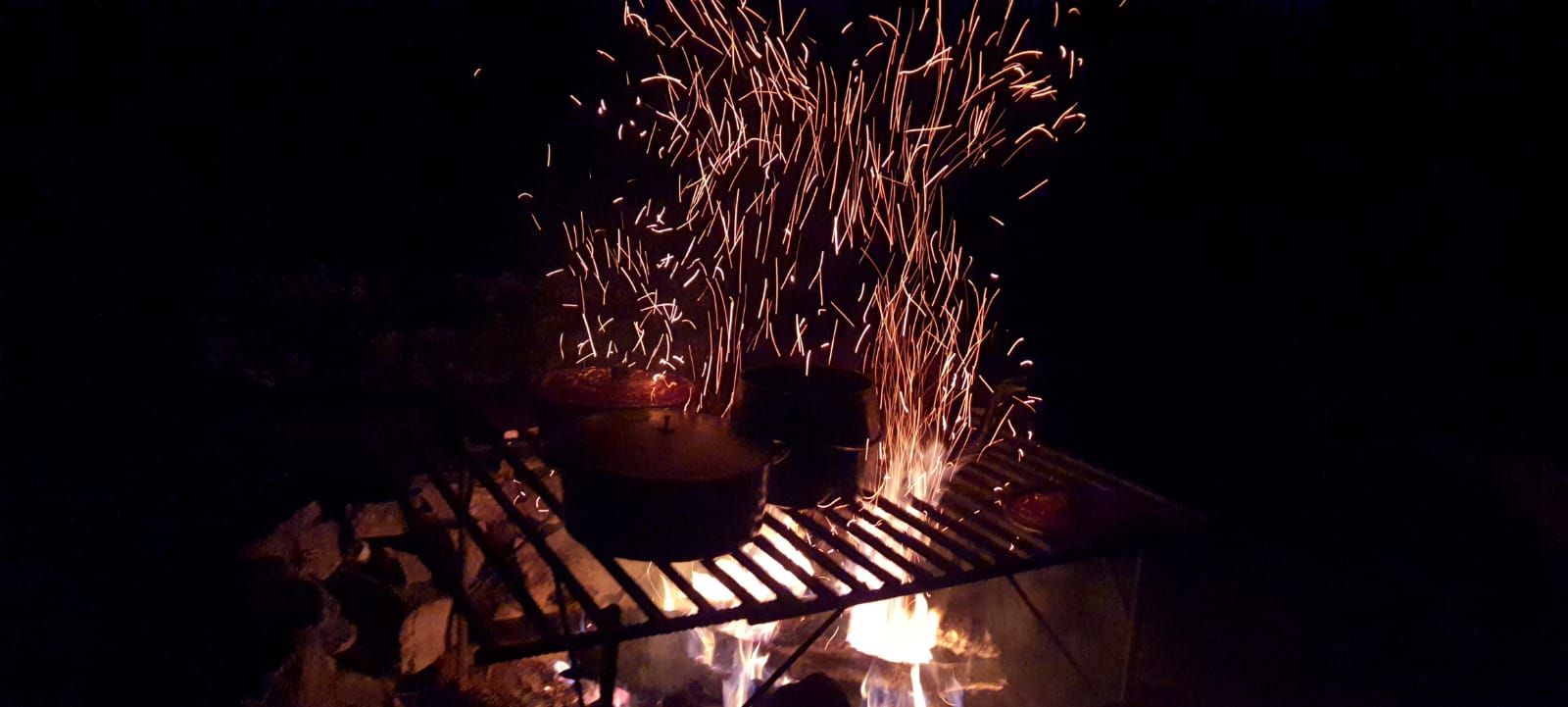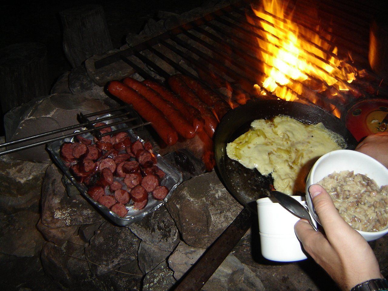 O jantar é arroz carreteiro, linguiça e queijo derretido, pão, suco, vinho e sobremesa de tropeiro também, tudo ao redor de fogueiras, não tem luz a noite toda, mas muitas,