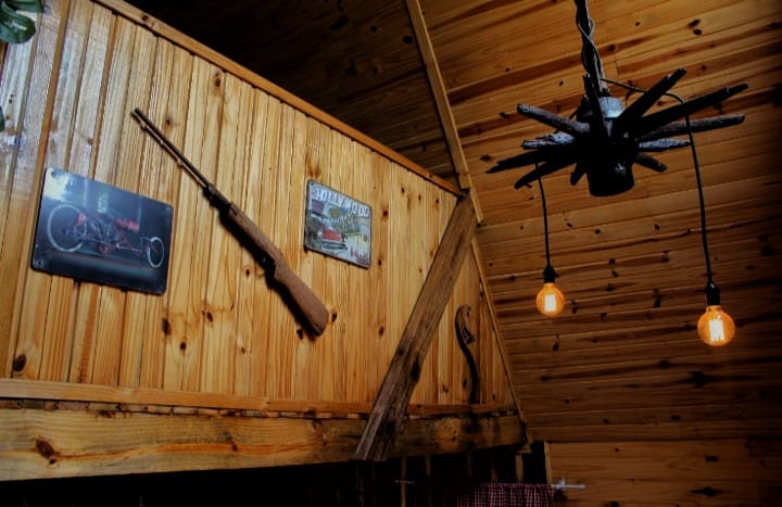 A cabana conta com quarto, sala, cozinha com utensílios (o local não serve refeições), banheiro, ar condicionado, wifi, Tv, espaço externo amplo e privativo com mini pracinha para crianças, local no estilo rustico trazendo consigo o sossego e aconchego, aumentando o vínculo familiar e aproximando-o com a natureza.
