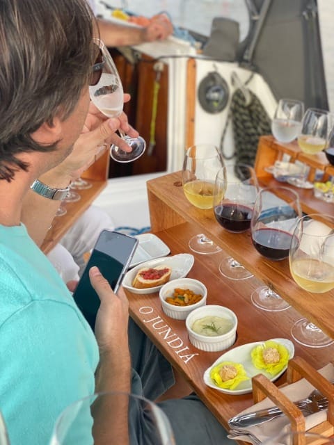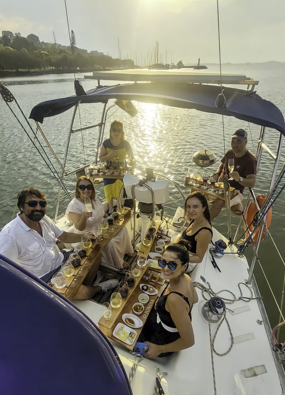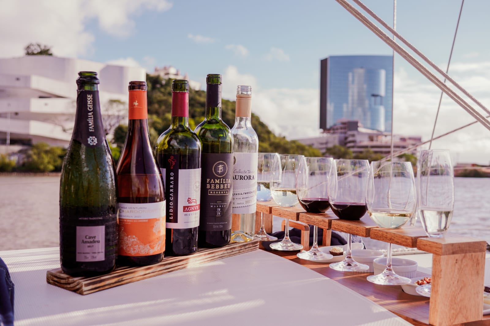 veleiro é ancorado e o sommelier entregará uma régua de degustação com vinhos e comidinhas aos clientes. A régua contém um copo de espumante, dois copos de vinho branco, dois tipos de vinho tinto e um copo de água, além de 05 pratinhos com snacks, prato de entrada, 02 pratos principais e sobremesa.