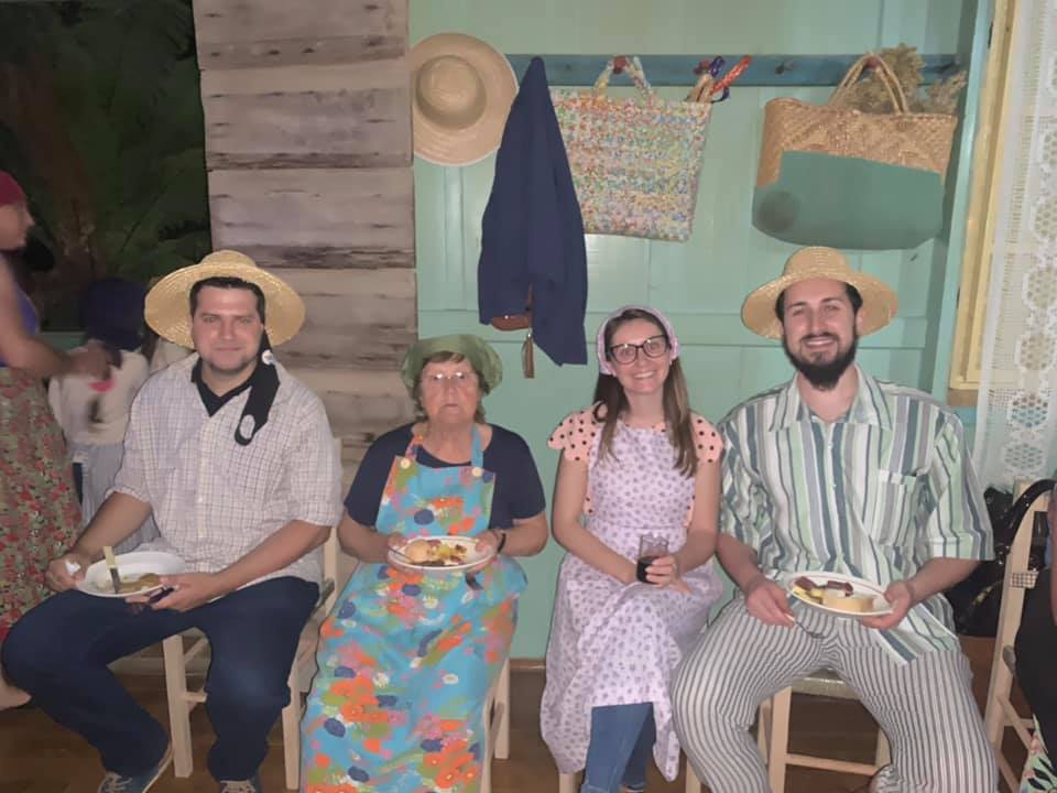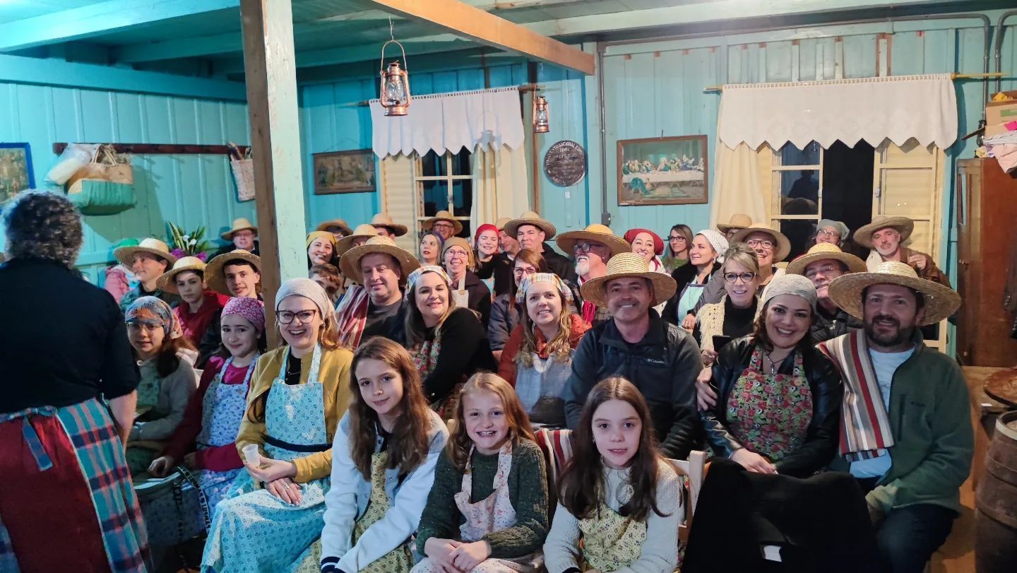 Participação do Filó e uma confraternização com comidas típicas como polenta na calheira, polenta brustolada, molho de peito de frango 'tocho', grostoli, sfregolá, bolos diversos, pão de forno, queijo, salame, copa, amendoim, pinhão, cuca, batata doce, moranga caramelada, pudim, suspiro, bergamota, vinhos, sucos e e demais produtos sazonais.