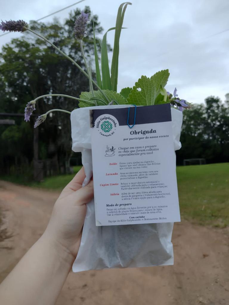 Na saída, a família recebe um pacote com ervas colhidas na hora que ajudam na digestão e no relaxamento, com instruções de preparo e benefícios de cada planta. Caso tenha crianças na família, elas são convidadas a fazer parte da hora da colheita das ervas, aprendendo a diferenciar uma das outras e aumentando o interesse pelas suas propriedades.