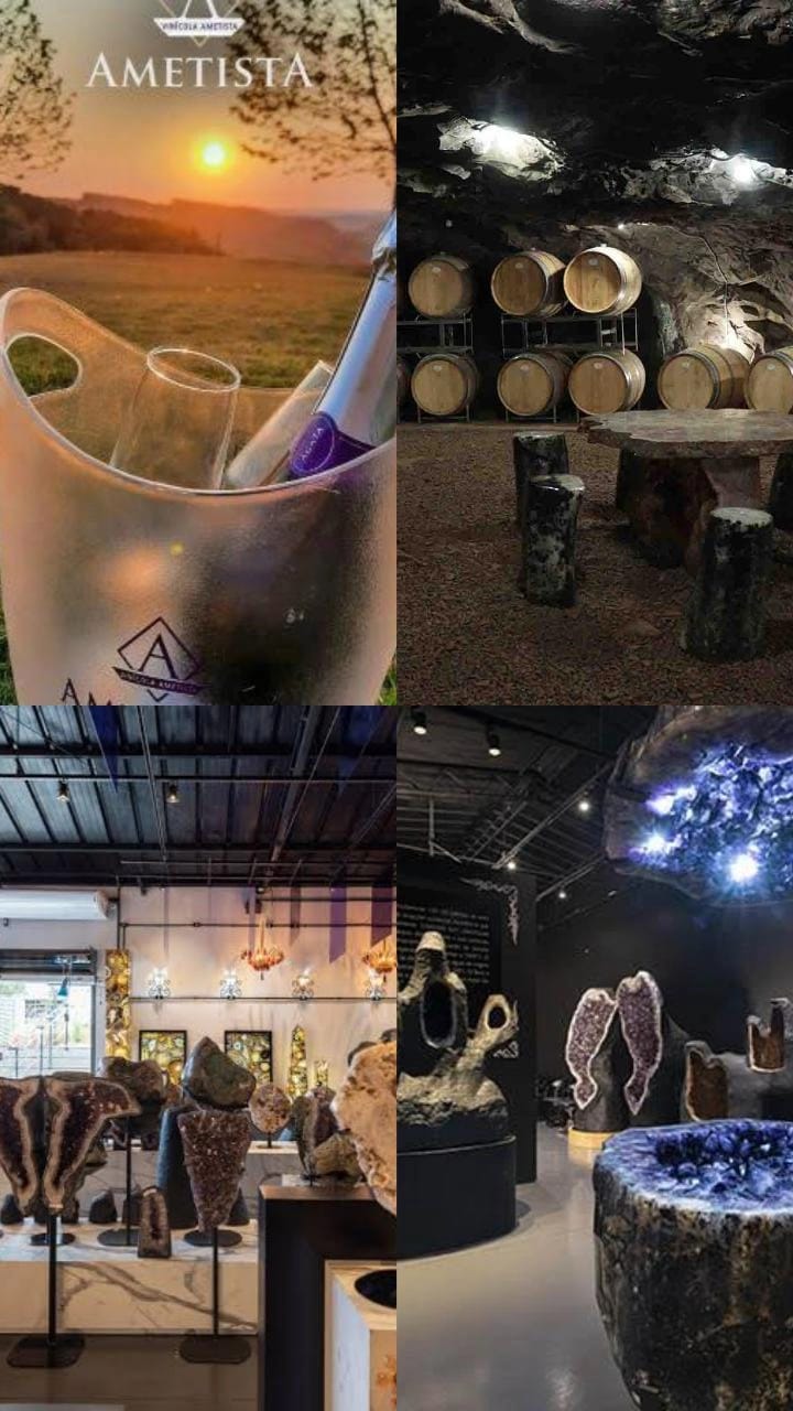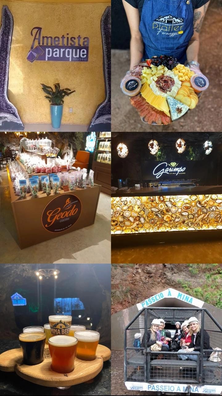 Neste roteiro você vai conhecer o Complexo Belvedere: restaurante, piscina, museu de minerais gigante, garimpo semi-ativo, loja de chocolate, adega de vinhos, tirolesa; o Centro de Mineralogia: ciência e conhecimento agregados aos minerais preciosos; o Shopping das Pedras: mais de 15 lojas de pedras e artesanatos; a LP Minerais: maior loja de pedras preciosas e semipreciosa do Brasil; o Garimpo em Atividade: como funciona o garimpo no dia a dia e demonstração da explosão; a Ametista Parque Museu: Restaurante Garimpo, Geodo Cacau, Plater Formaggi, Mina Beer, adega de vinhos, todos situados no subterrâneo; a Vinícola Ametista: passeio subterrâneo, vinhos envelhecidos no subsolo e degustação de vinho e sucos; a Galeria Capra: exposição de pedras, sala de energização, tour virtual e loja de pedras.