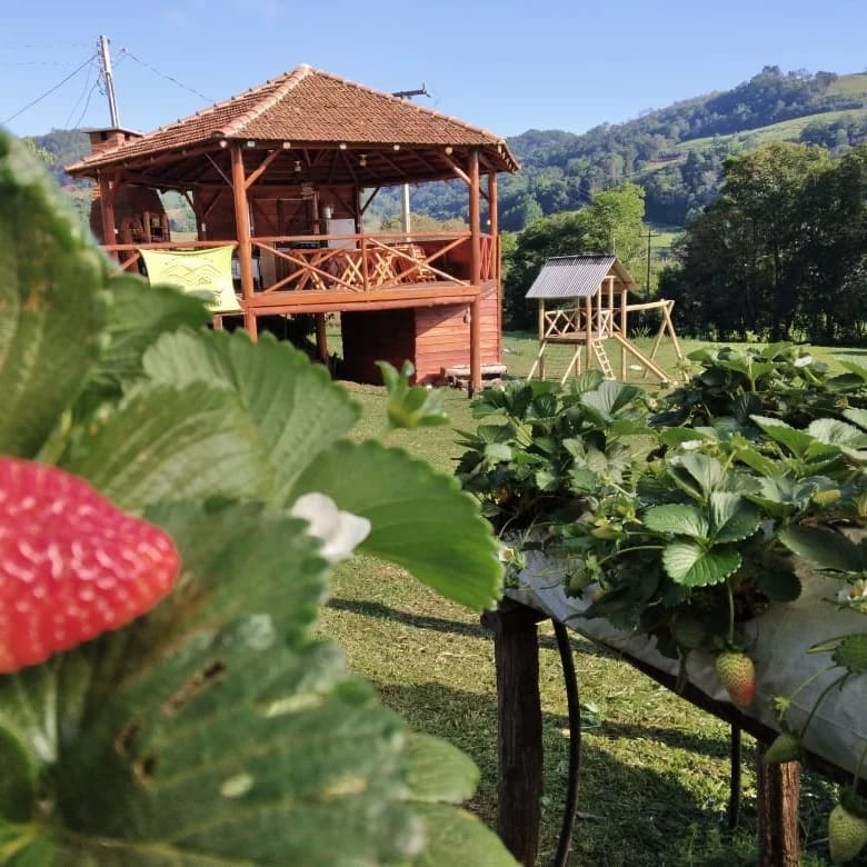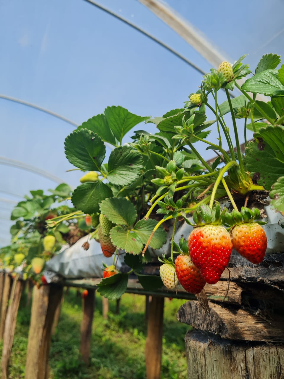 O espaço conta com uma estufa de morangos, onde os visitantes podem colher, pesar e pagar pela fruta na hora.