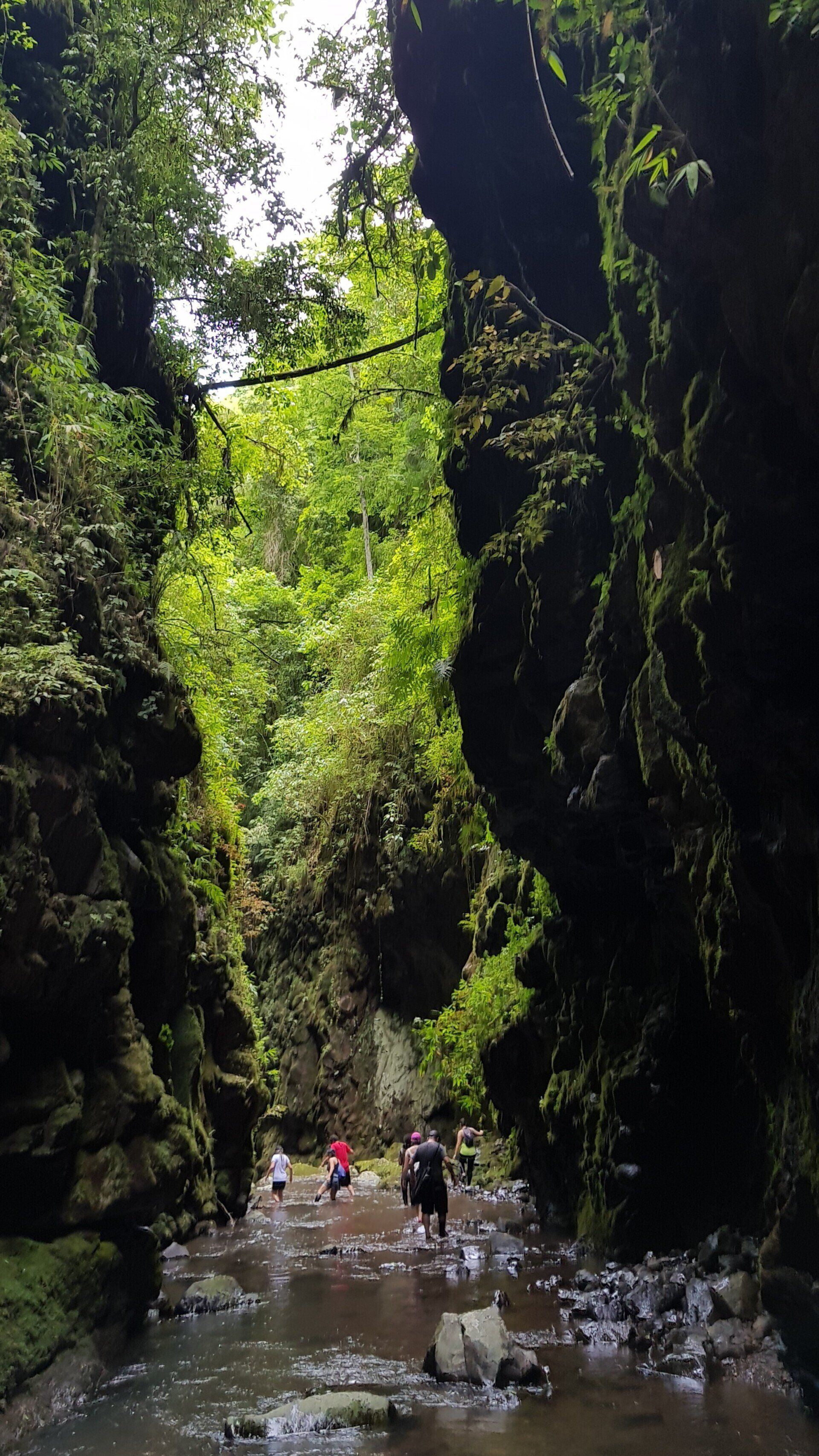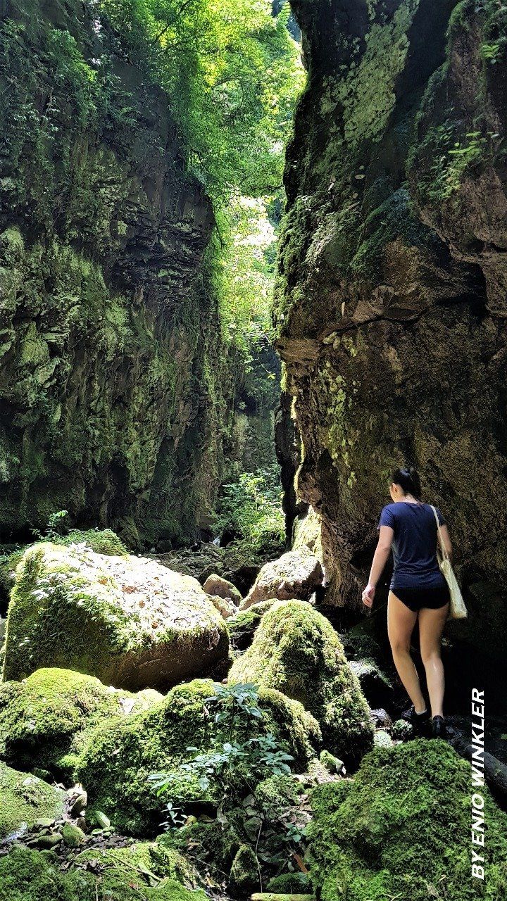 de imersão à natureza, mata atlântica preservada, um aquatrekking em sinuosas pedras dentro de um Cânion que se afunila, quando você percebe está dentro de uma fenda e ao fundo bem acima uma rocha com formato de um bico de gavião e deslizando sobre ela águas que formam uma cachoeira.