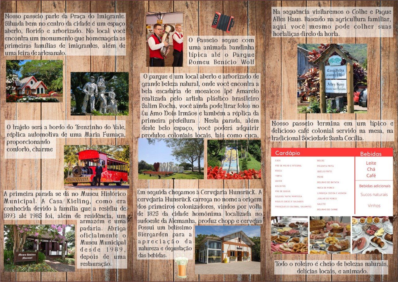Depois, pausa para o almoço no Café Colonial na Sociedade Santa Cecilia e em seguida, ida para o Museu Histórico Municipal, Padaria Becker e por fim o Parque Romeu Benicio Wolf.