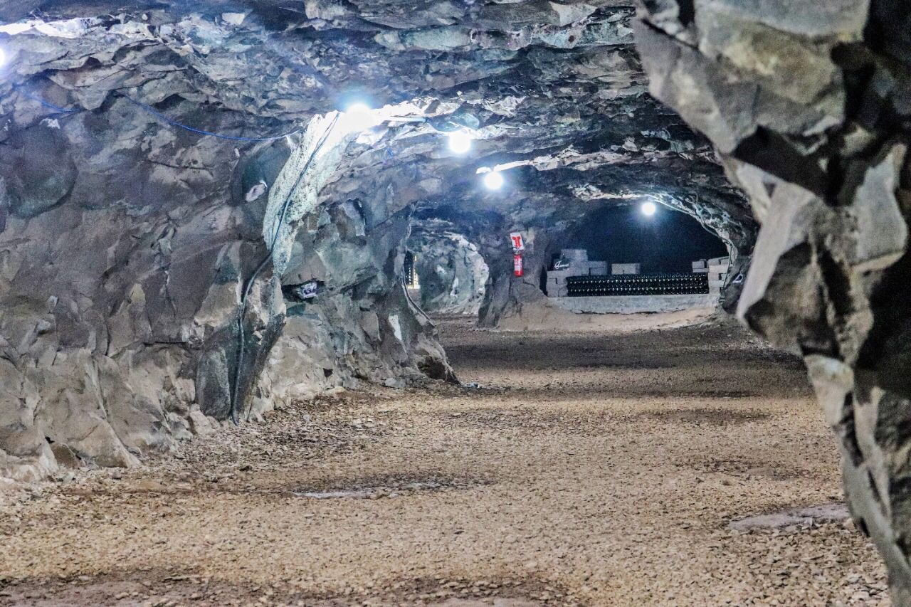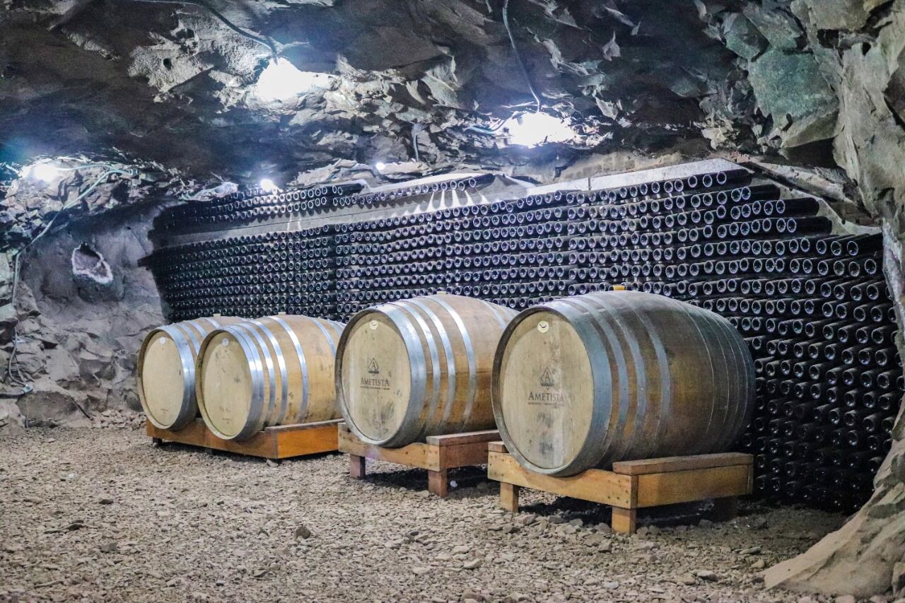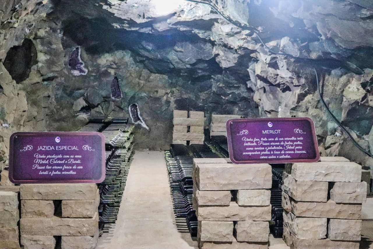 280 mil litros por safra. Os vinhos são armazenados em uma antiga mina de extração de geodos, com cerca de 300 metros de profundidade, onde a temperatura se mantém de