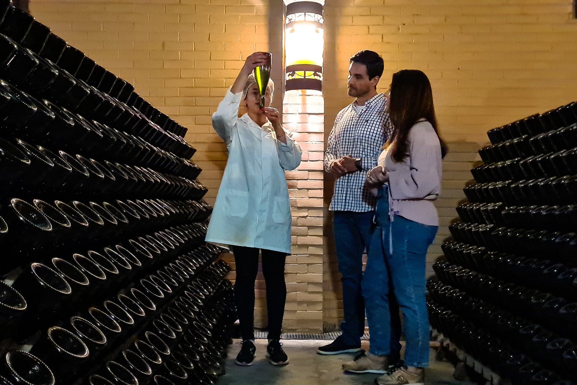 degorgement dos espumantes elaborados pelo método tradicional. Na passagem pela Cave, é possível observar toda armazenagem dos produtos e entendendo o processo de elaboração dos espumantes pelo método tradicional até sua finalização para expedição. Em seguida o passeio se encaminha pela