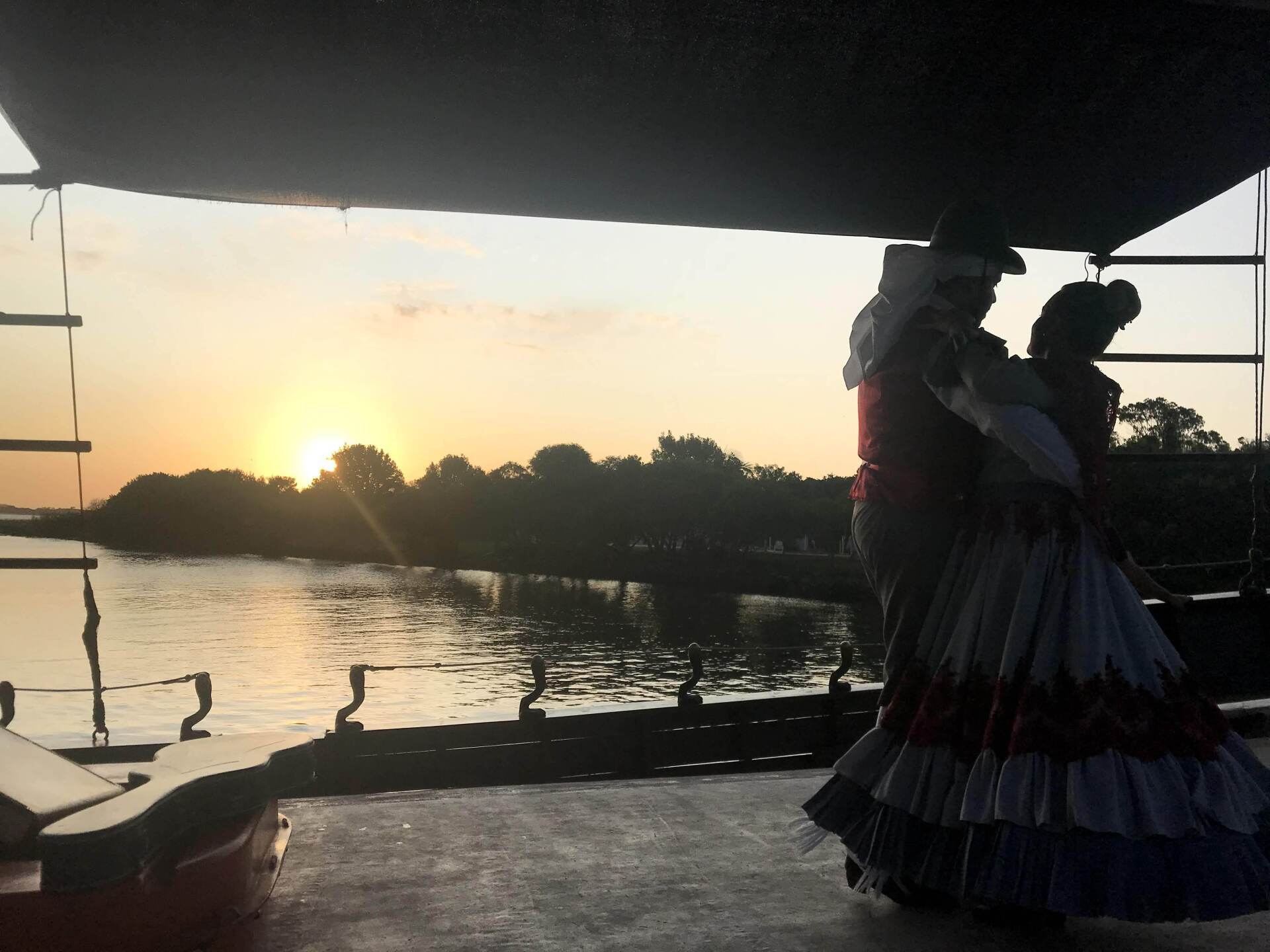 A bordo da embarcação, totalmente construída nos estaleiros de São Lourenço do Sul, o grupo vai navegar pelas águas do arroio. É neste momento que começa uma das partes mais emocionantes do passeio. Contemplando o por do sol de um ponto de vista privilegiado, os turistas vão apreciar um concerto com um violinista. O instrumento foi escolhido porque faz parte da história do Rio Grande do Sul. Foi trazido para cá pelos padres jesuítas que vieram com a missão de catequizar os índios. A escuna transporta os turistas até a Fazenda do Sobrado.