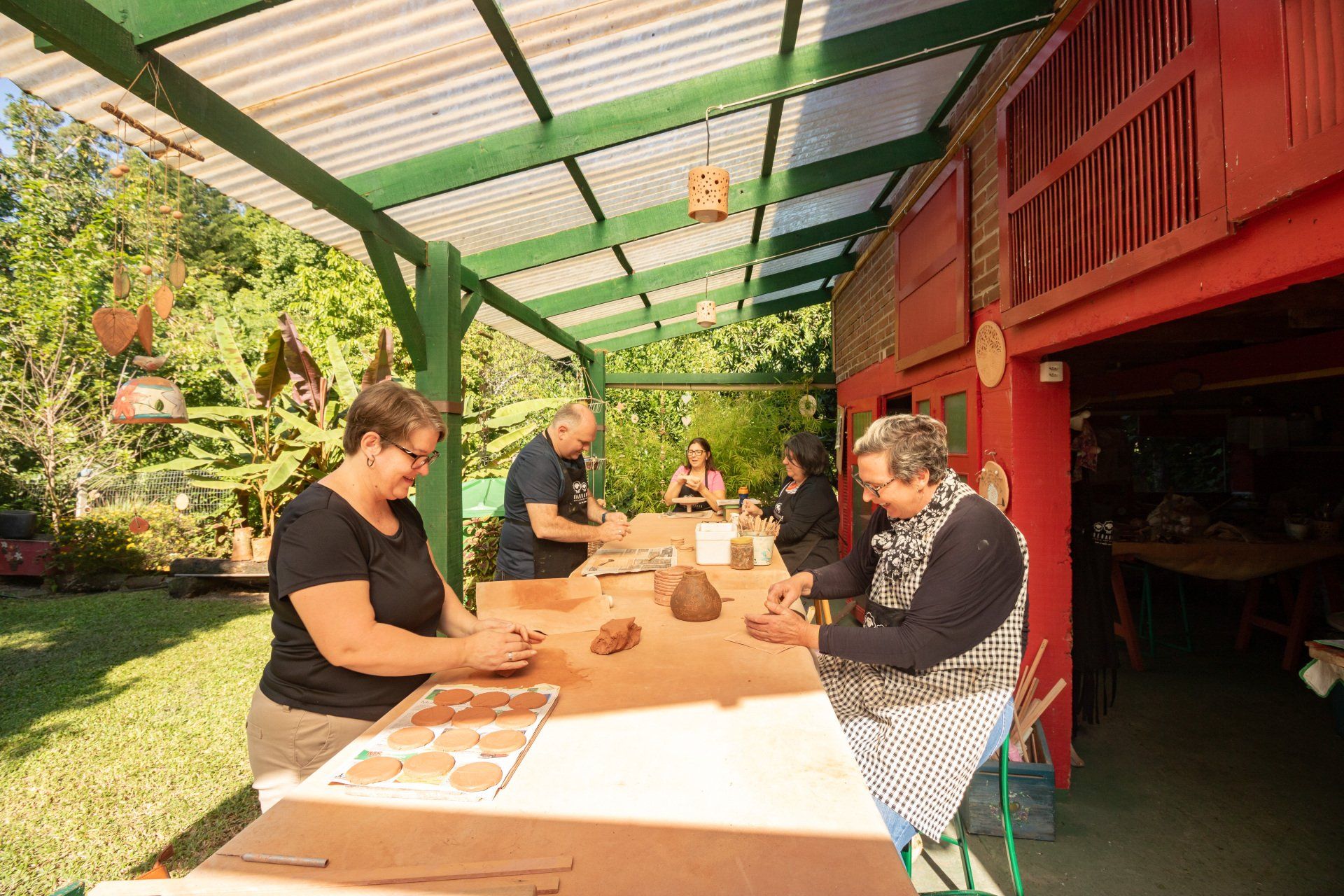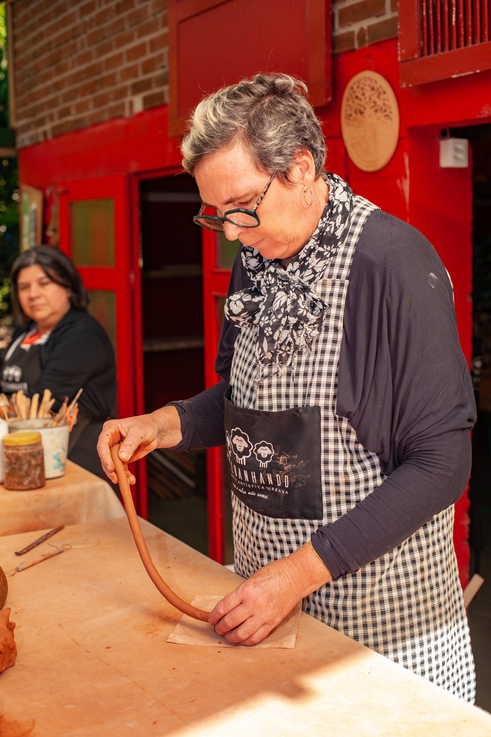 Além da visita guiada a área verde no centro da cidade de Arroio do Meio, oferecemos uma vivência de modelagem com argila resgatando a técnica do acordelado (técnica guarani) e oferecemos uma pequena peça já concluída e queimada para o turista levar como memoria.